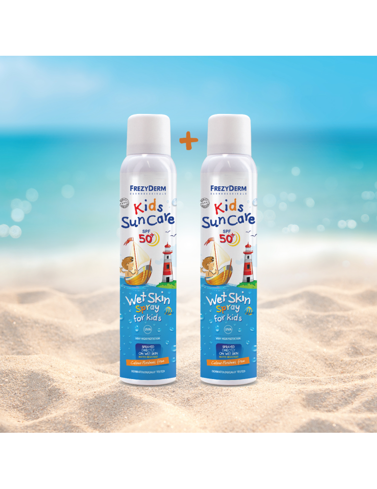 Frezyderm Kids Sun Care SPF 50+ Wet Skin Spray: Αντηλιακό spray που ψεκάζεται απευθείας σε βρεγμένο δέρμα και παρέχει πολύ υψηλή προστασία. Είναι ιδανικό για παιδιά καθώς ο τρόπος εφαρμογής του είναι ειδικά σχεδιασμένος ώστε να μην διακόπτεται το παιχνίδι ή η αθλητική δραστηριότητα στη θάλασσα και την παραλία.
