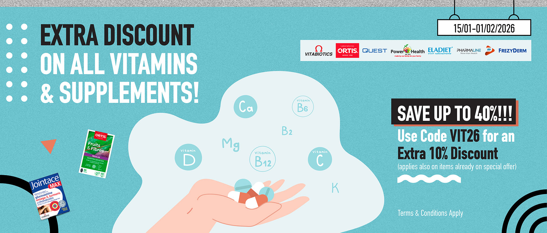 Order in time and save up to 40% on *all vitamins and supplements! From 15th of January until 1st of February, use the new discount coupon VIT26 and benefit from an extra 10% discount on our existing great offers and reduced prices! The offer is valid for the brands VITABIOTICS, ORTIS, POWERHEALTH, QUEST, PHARMALINE, ELADIET and FREZYDERM.