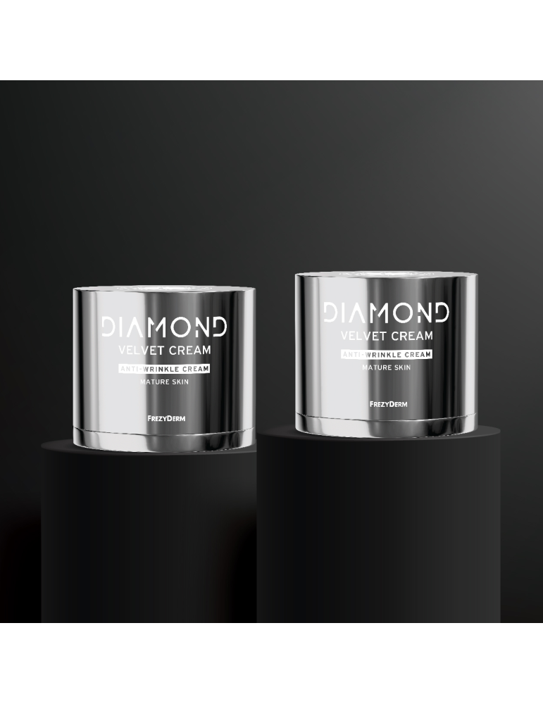 Face Cream of enhanced anti-aging action for immediate firming and rapid reduction of wrinkles on mature and/or damaged skin, without aesthetic interventions. The innovative structure of the natural diamond crystals and Boron Nitride accelerate the renewal of the skin and offer a unique glow. At the same time, the specially selected active ingredients, based on the Science of Epigenetics, increase the production of collagen, elastin and hyaluronic acid, drastically reversing the course of wear and tear over time. Skin regeneration is accelerated, skin density is increased, firmness and elasticity are restored, wrinkles are effectively "filled" and natural glow is visibly restored. In addition, Diamond Velvet Anti-Wrinkle Cream has a specially designed composition that offers deep and prolonged hydration to the skin while maintaining its moisture reserves.