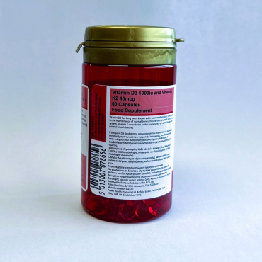 Each capsule contains 25μg of vitamin D3 (1000iu) and 45μg of vitamin K2.